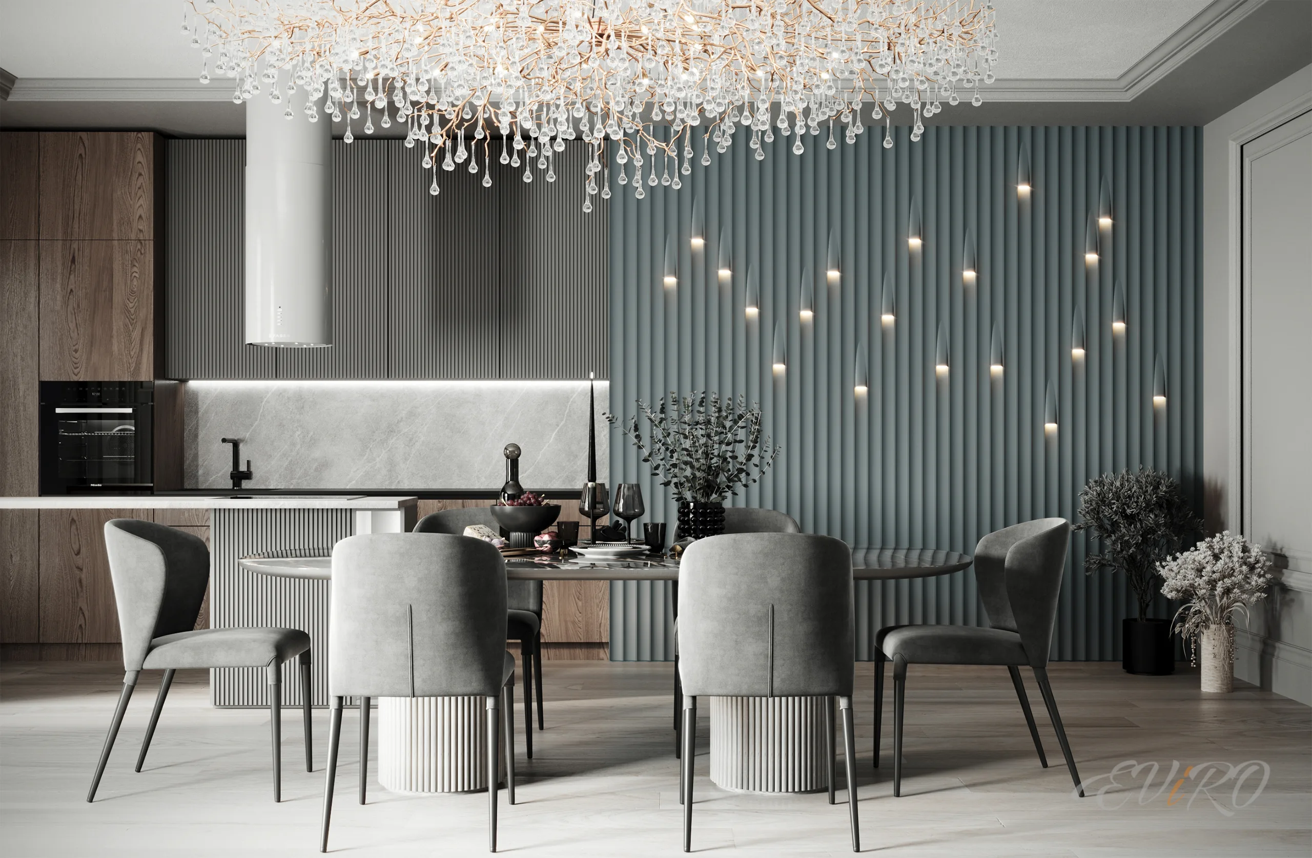 Мелкая гипсовая рейка Rollers, в свою очередь, привносят в интерьер ощущение легкости и движения благодаря своей округлой форме. Чередование строгих вертикальных линий Steps и плавных изгибов Rollers рождает на стене неповторимый ритм, притягивающий взгляд и подчеркивающий индивидуальность вашего дома. Мягкий, рассеянный свет, льющийся из гипсовых реек Steps, окутывает гостиную теплом и уютом, создавая атмосферу релаксации и гармонии.